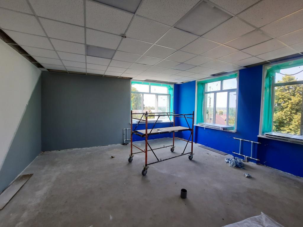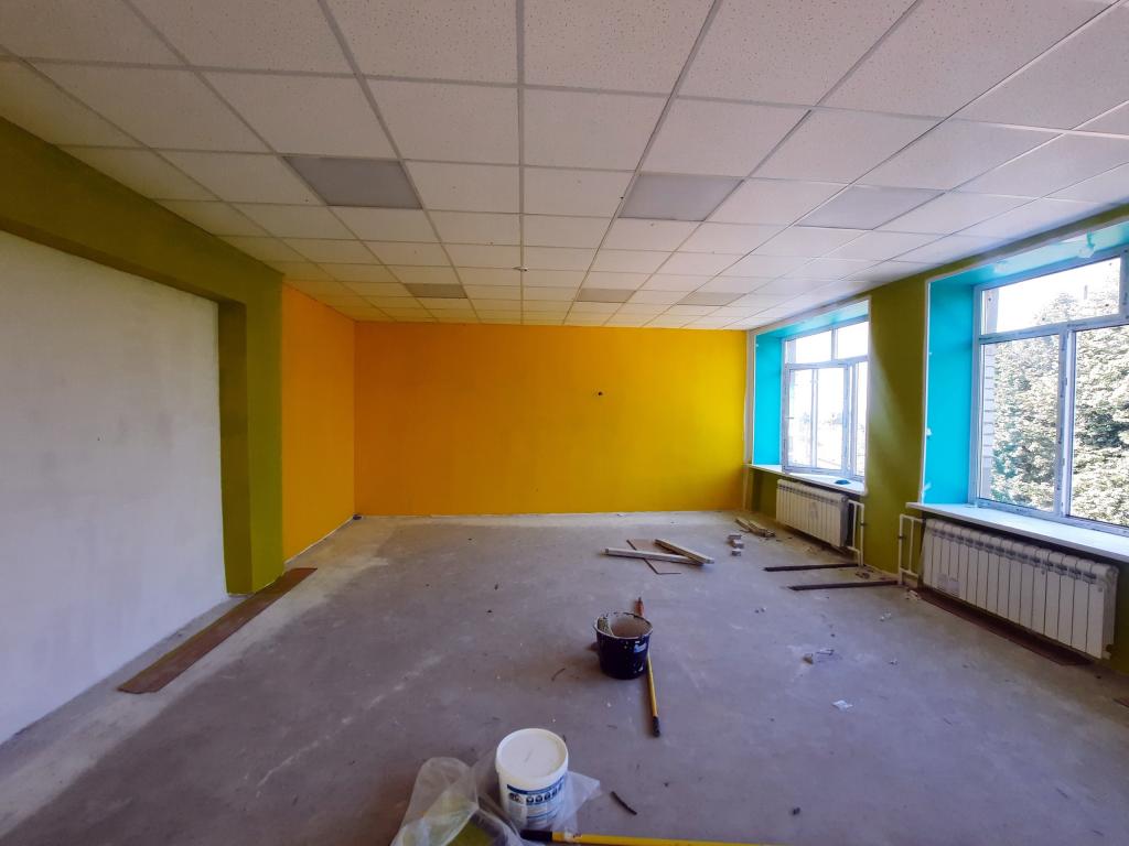 Сейчас здесь красят стены в классах, устанавливают радиаторы отопления, которые были сняты на время покраски. Кроме того, ведутся работы по отделке стен в коридорах.