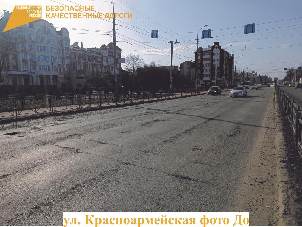 На Красноармейской дорожное полотно ежедневно получает очень интенсивную нагрузку. По нему проезжает около 8 тысяч машин. Ежегодно на дороге проводился поддерживающий ремонт, который временно улучшал ситуацию, но проблему не решал. Поэтому в рамках дорожного нацпроекта за неё взялись основательно.