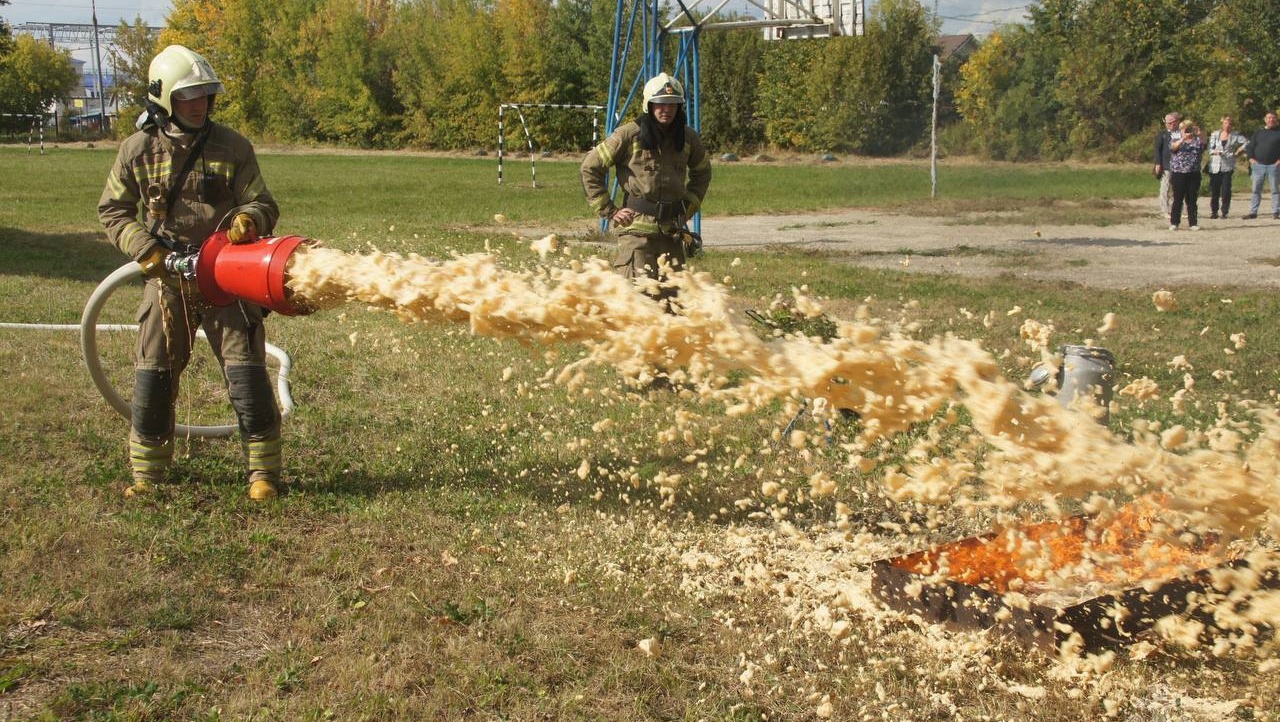 После этого звенья газодымозащитников спасали условных пострадавших. Один статист был выведен на улицу при помощи спасательного устройства типа «капюшон», другой — по пожарному коленчатому автоподъёмнику. Одним из этапов показательных занятий стало и тушение противней c горючей жидкостью.
