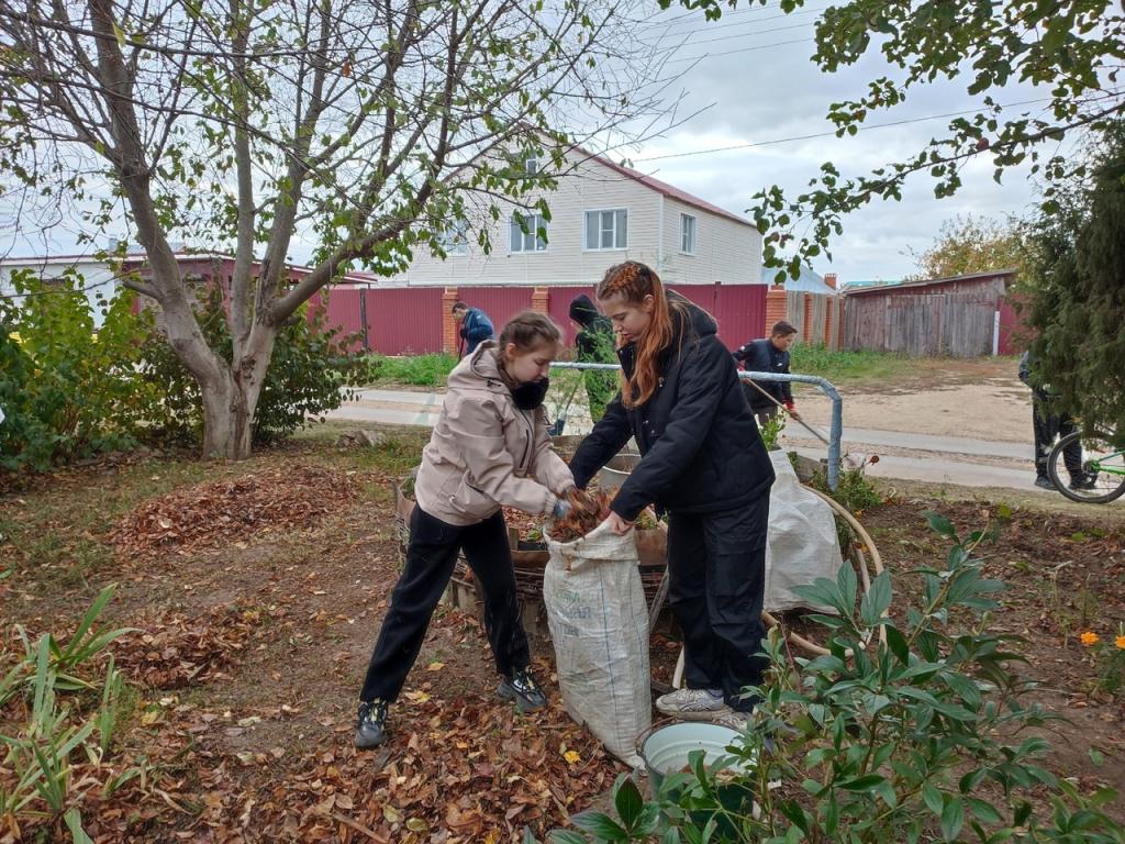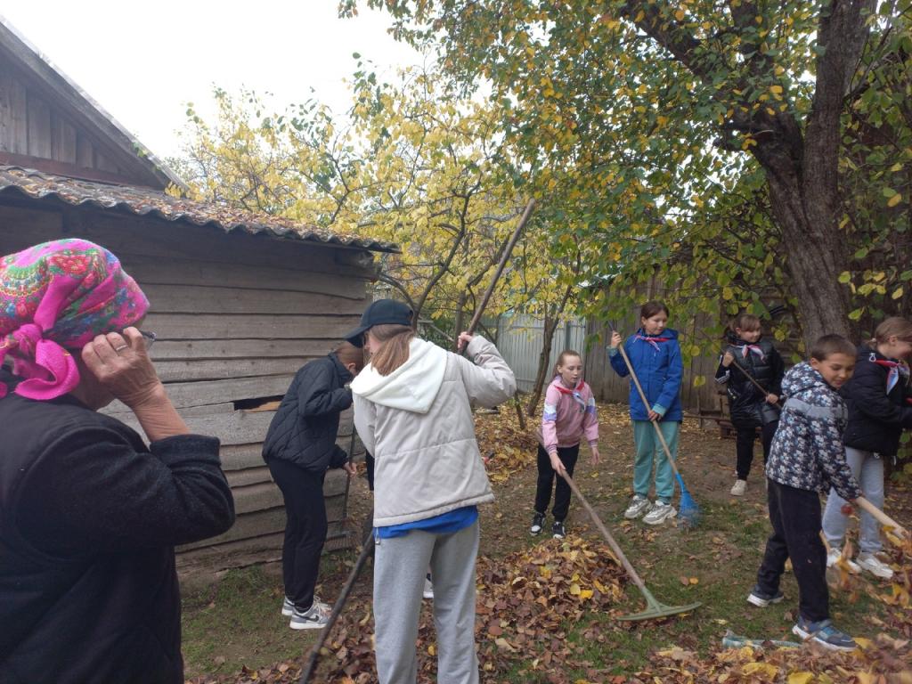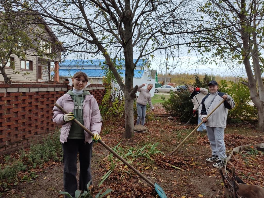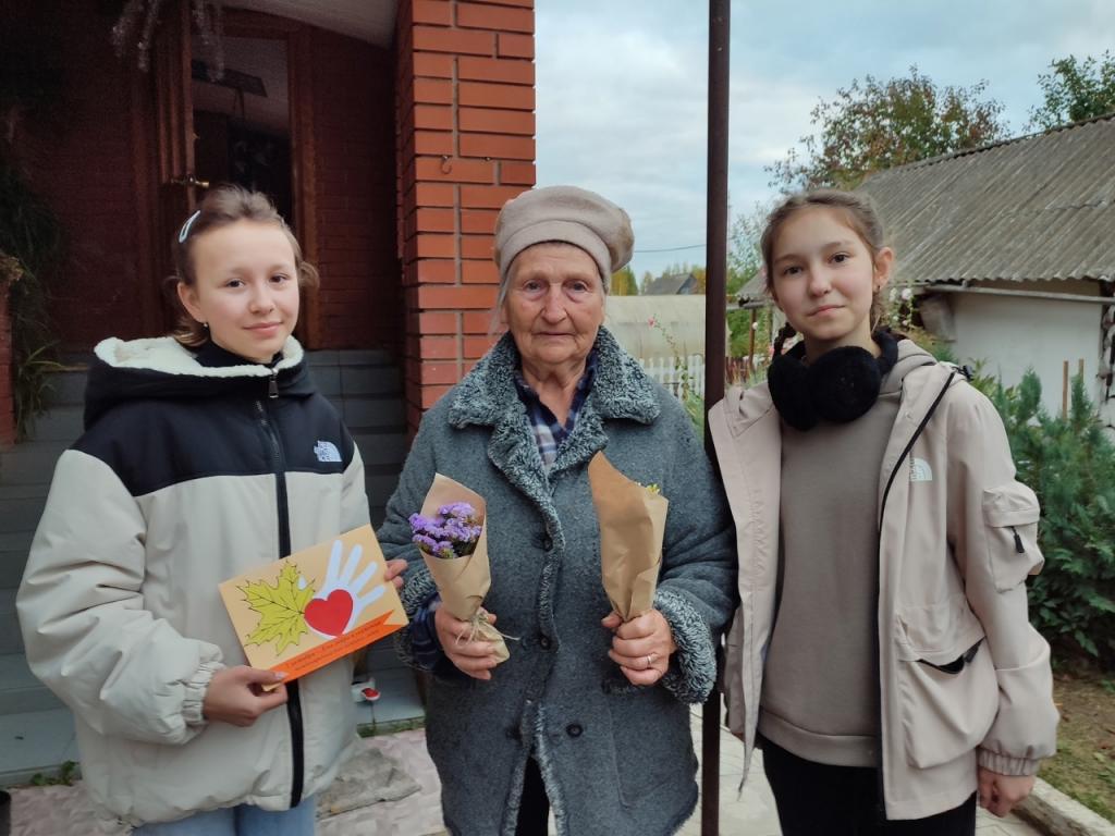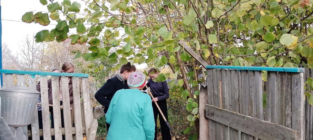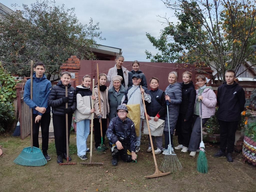 Активисты первичного отделения Движения первых сернурской школы № 2 тоже посетили пенсионеров — Аркадия Николаевича и Валентину Михайловну Соловьёвых. Они поздравиили супругов с наступающим Днём пожилых людей и очистили от листьев двор, сад и территорию перед домом.