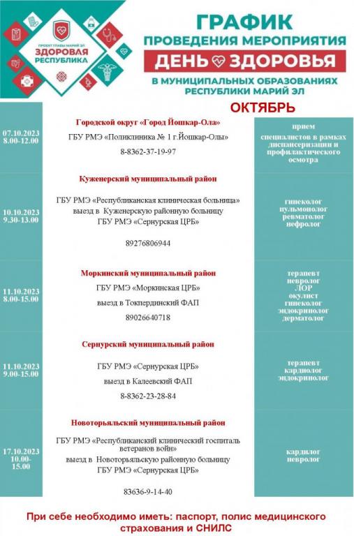 11 октября День здоровья запланирован в Токпердинском ФАПе Моркинского района и Калеевском ФАПе в Сернурском районе. В первом с 8:00 до 15:00 будут проводить осмотры терапевт, невролог, лор, окулист, гинеколог, эндокринолог, дерматолог. В деревню Калеево приедут терапевт, кардиолог и эндокринолог. Их часы работы — с 9:00 до 15:00.