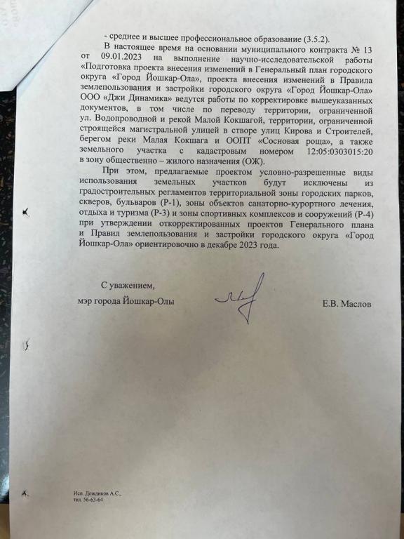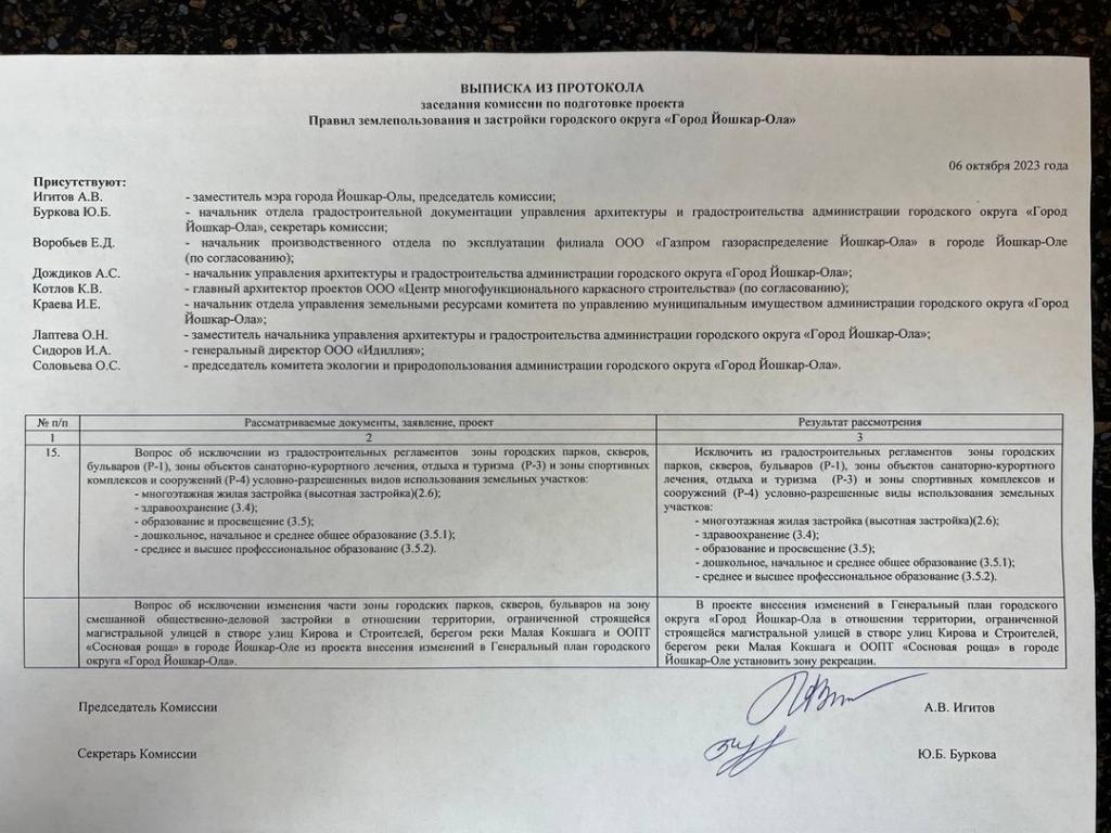 Йошкаролинцам продемонстрировали графические материалы, документы, которые призваны были доказать — администрация Йошкар-Олы не имеет намерений застраивать каким-либо образом земли заливных лугов. Когда будет актуализироваться генеральный план Йошкар-Олы, Парковая зона вблизи Сосновой рощи должна будет сохранить свой статус.