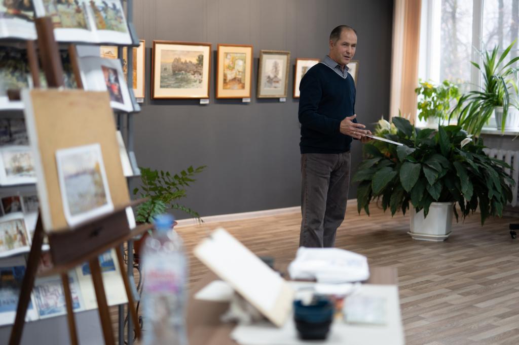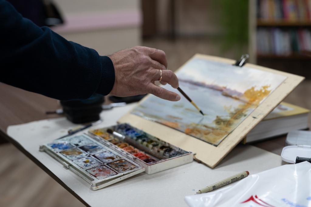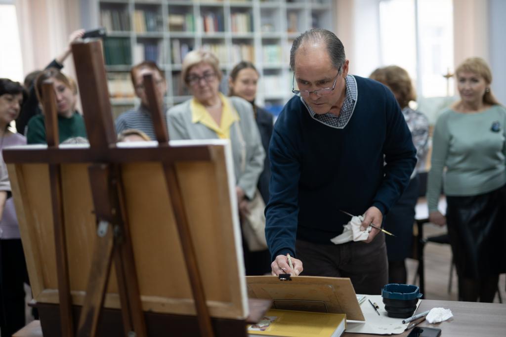 На встрече Сергей Алдушкин не только рассказал о себе и своём творчестве, но также отвечал на вопросы ценителей искусства. А затем показал, как создаёт свои пейзажи. Рисунок художник подарил библиотеке.