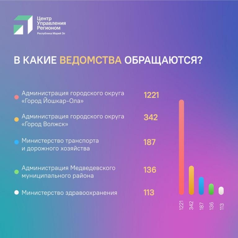 Больше всего обращений поступило в адрес администрации Йошкар-Олы, на втором месте — администрация Волжска, на третьем — Министерство транспорта и дорожного хозяйства, далее следуют администрация Медведевского района и Минздрав республики.