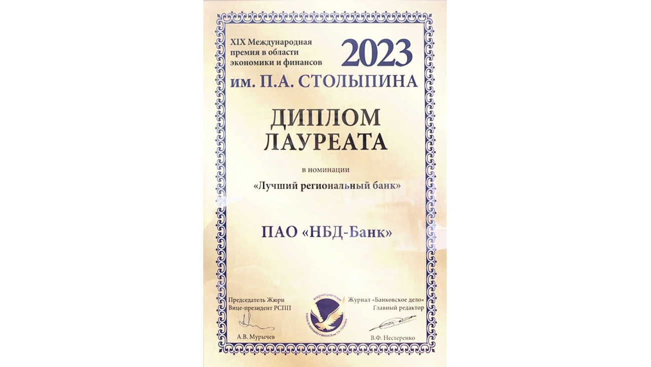НБД-Банк стал лауреатом премии в области экономики и финансов им. П.А. Столыпина