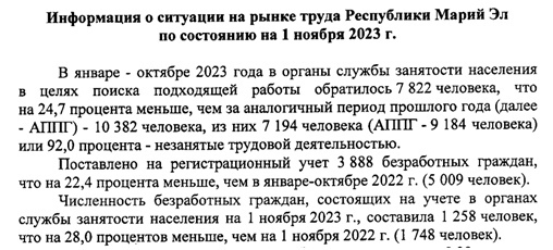 На регистрационный учёт было поставлено 3 888 безработных. На 1 ноября на учёте состояло 1258 жителей Марий Эл, находящихся в поисках работы.