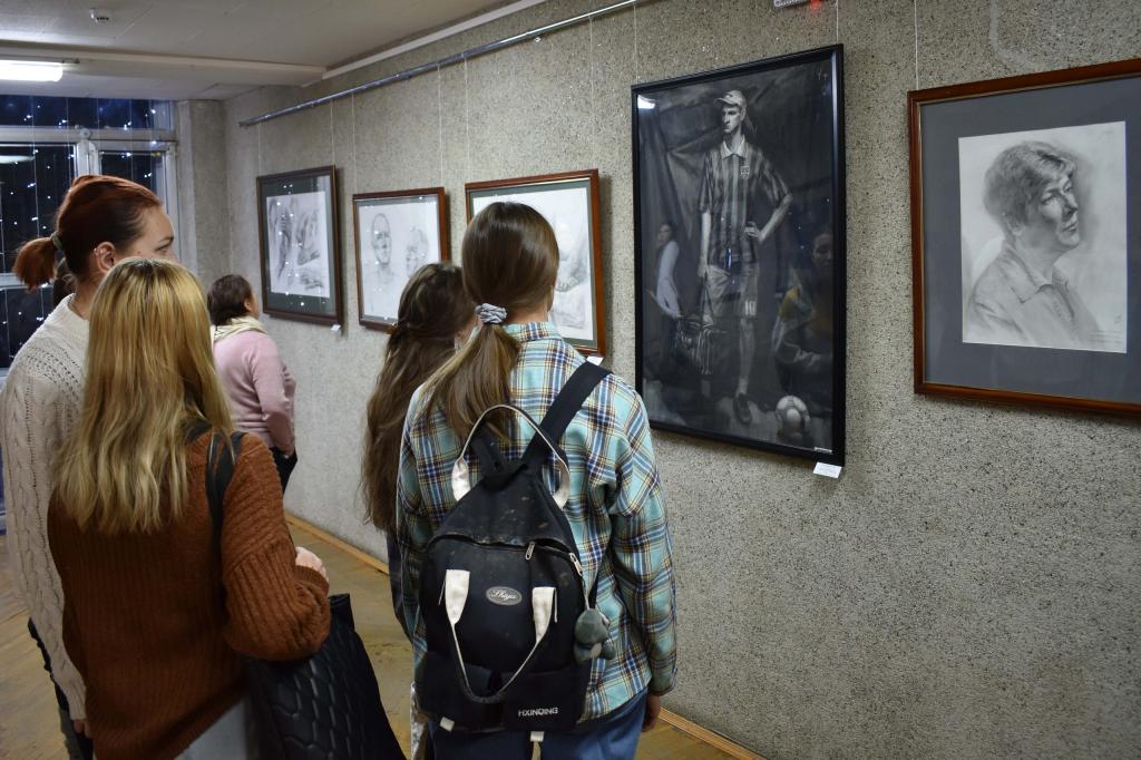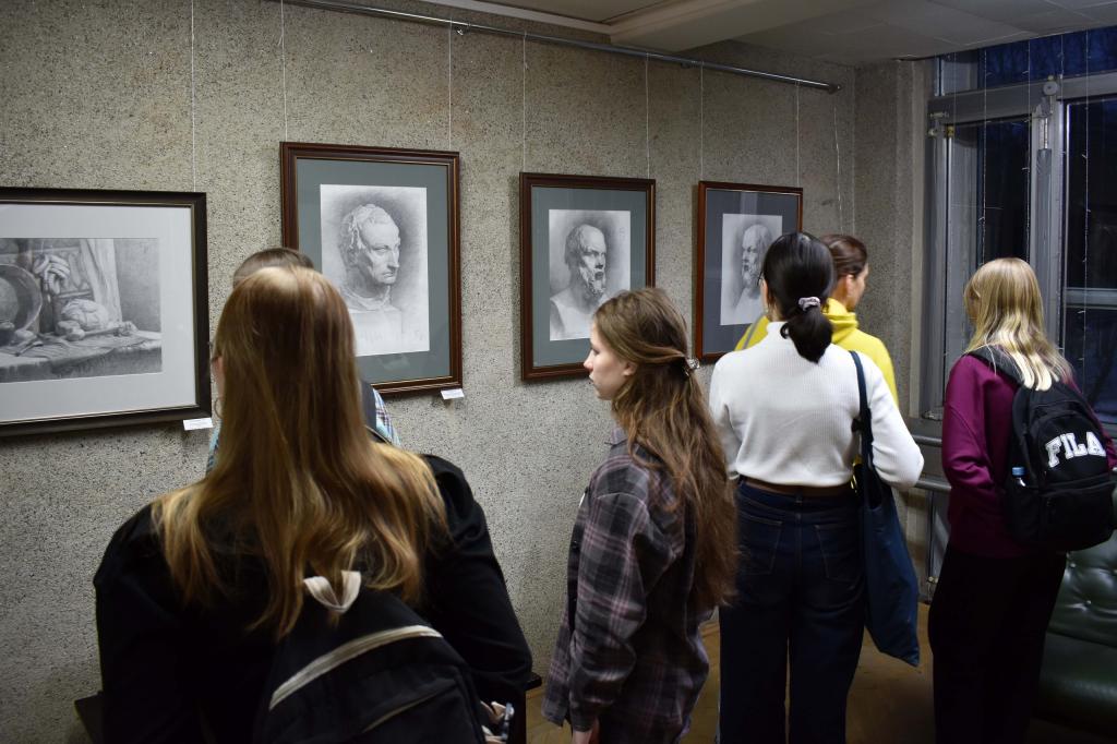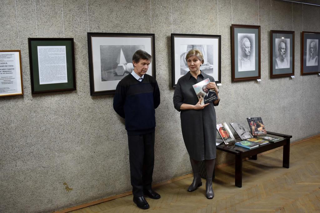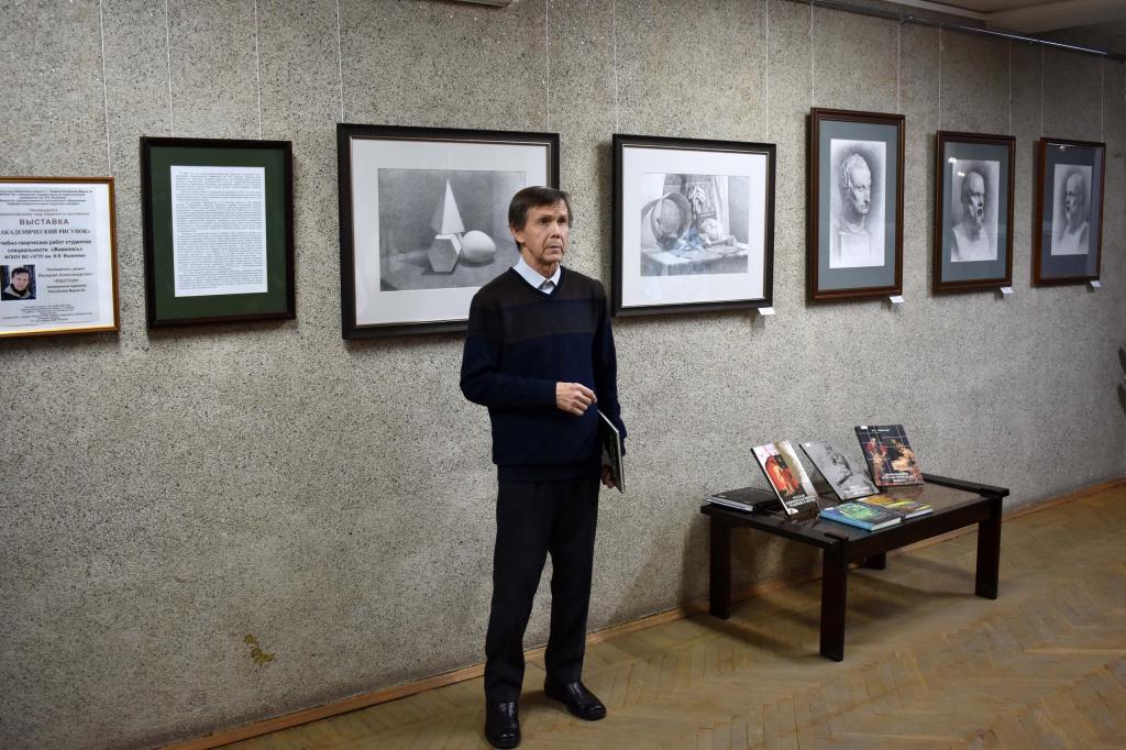 На открытии на примере студенческих работ он показал, как последовательно идёт становление обучающихся от простого натюрморта до сложных двухфигурных постановок к будущему профессионалу в области рисунка.