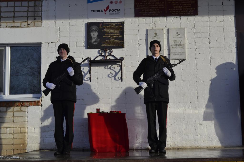 Памятная церемония также прошла в Сернурской школе № 1. Здесь появилась мемориальная доска в честь Евгения Алгаева. Стихи о папе прочитали дети военнослужащего, рассказали в марийском филиале фонда «Защитники Отечества».
