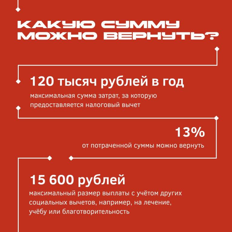 Максимальная сумма годовых затрат на эти услуги, с которых можно получить налоговый вычет, — 120 тысяч рублей в год. Вернуть можно 13% от потраченной суммы (максимум — 15 600 рублей) в совокупности с другими социальными вычетами: на лечение, обучение, благотворительность и иное.