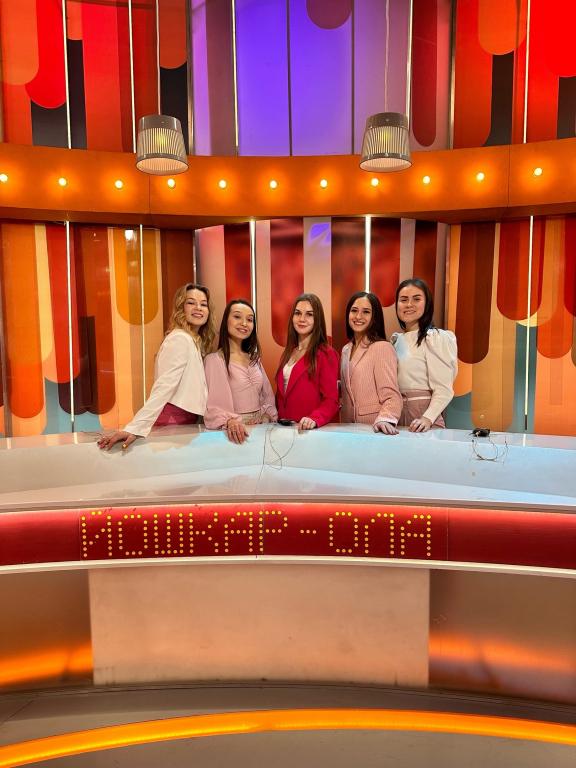 Девушки прошли отбор и сыграли в игру с ведущим Александром Акоповым. В программе они представляли спортивную команду.