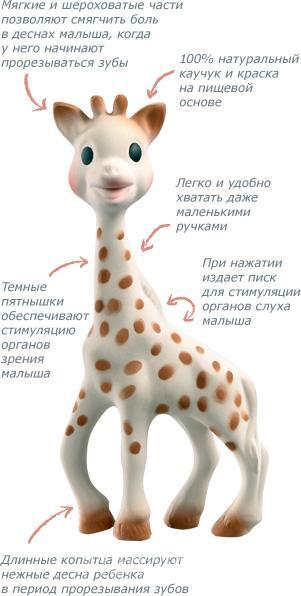 - неповторимый аромат натурального каучука из сока дерева гевеи делает Софи особенной и легко узнаваемой для малыша игрушкой;