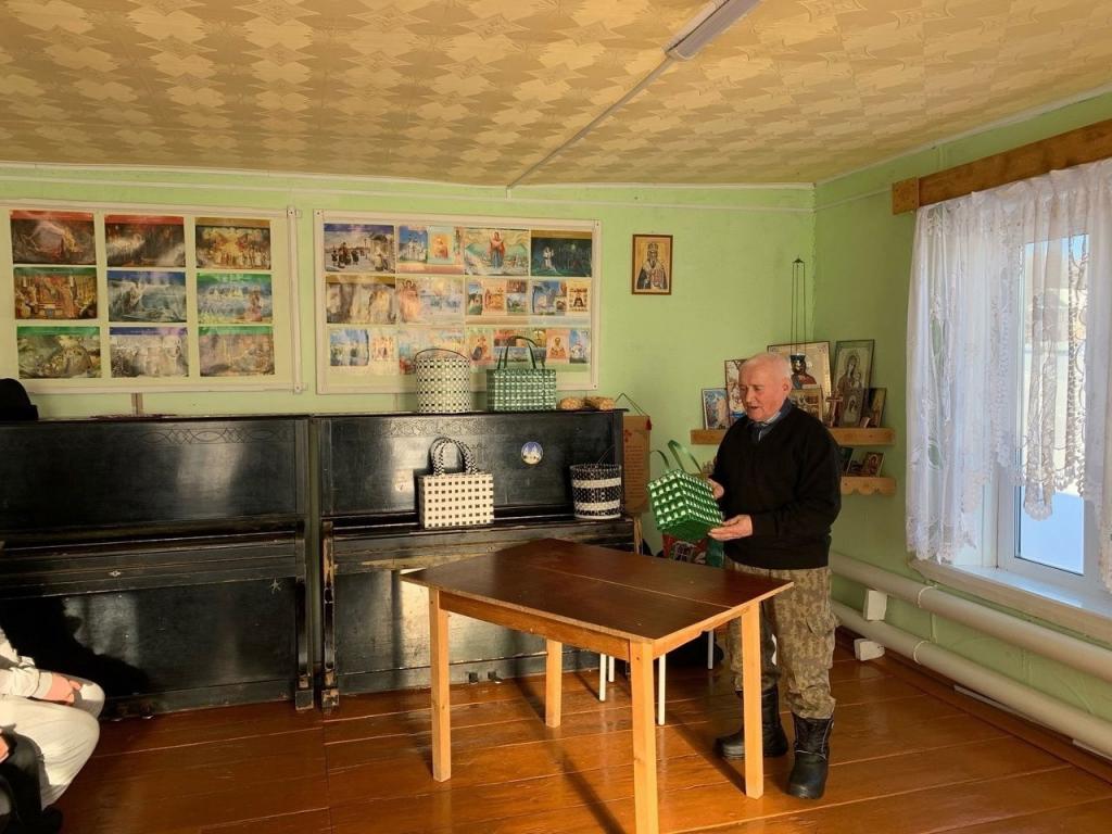 После завершения игры школьники встретились с прихожанами храма Анатолием Крыловым и Галиной Николаевой. Анатолий Александрович поделился техникой плетения лаптей и корзин из подручных материалов, а также прочитал стихи собственного сочинения. Галина Арсентьевна продемонстрировала глиняные горшки, которые они мастерят вместе с мужем Анатолием Ивановичем.