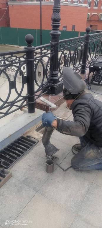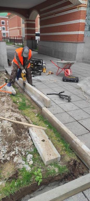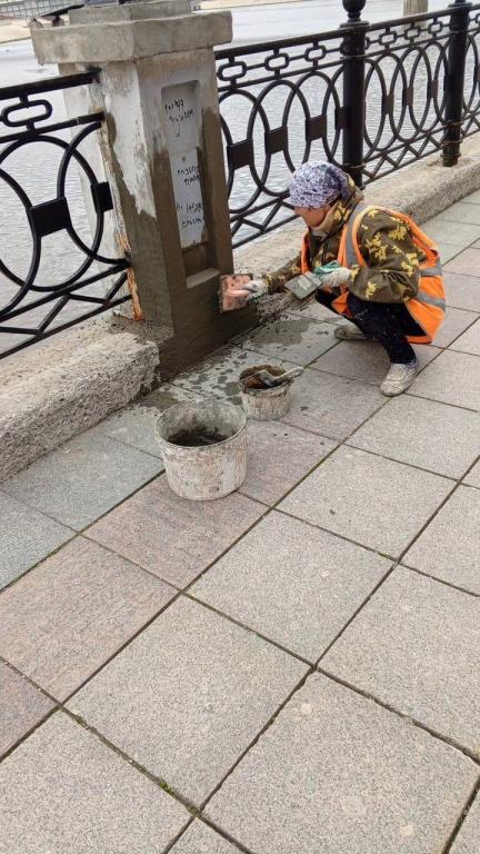 Подрядная организация занимается переустановкой покосившихся бортовых камней, ремонтирует лестничные сходы с полным восстановлением основания, заливает бетоном парапеты. Кроме того, шлифуются мраморные ограждения, обновляется ливнёвка на Гоголевском мосту.