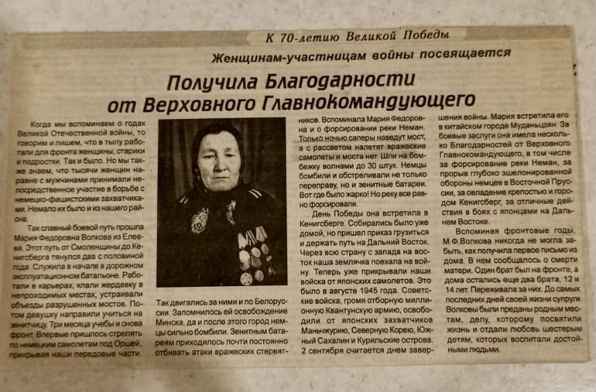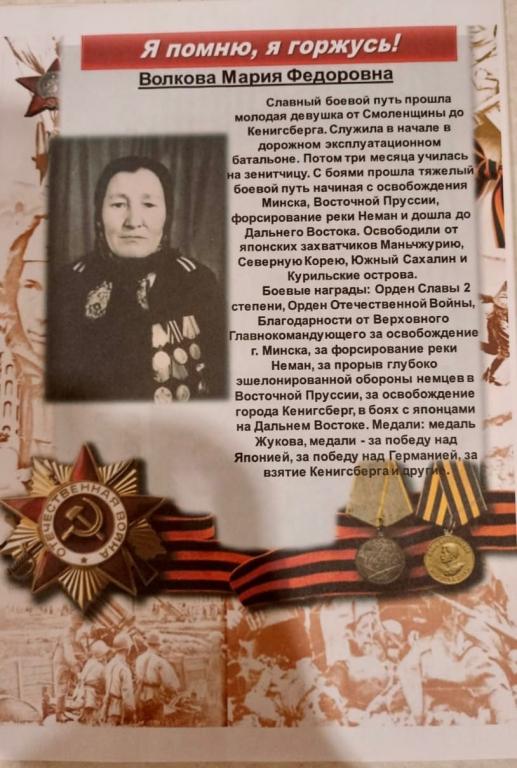 «Моя бабушка Мария Федоровна Волкова из посёлка Елеево Параньгинского района Марийской АССР. Молоденькой девчонкой ушла на фронт. Она прошла боевой путь от Смоленщины до Кёнигсберга (Калининграда) за два с половиной года. Служила сперва в дорожном эксплуатационном батальоне. Работали в карьерах, клали жердевку в непроходимых местах, устраивали объезды разрушенных мостов. Потом девушку направили учиться на зенитчицу. Три месяца учебы — и снова на фронт. Впервые пришлось стрелять по немецким самолетам под Оршей, осуществляя прикрытие советских войск.