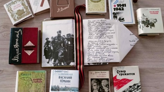 Среди экспонатов — «Василий Тёркин» Александра Твардовского, «Судьба человека» Михаила Шолохова, «Русский характер» Алексея Толстого, «Взятие Великошумска» Леонида Леонова, поэтические произведения Константина Симонова и Ольги Берггольц.