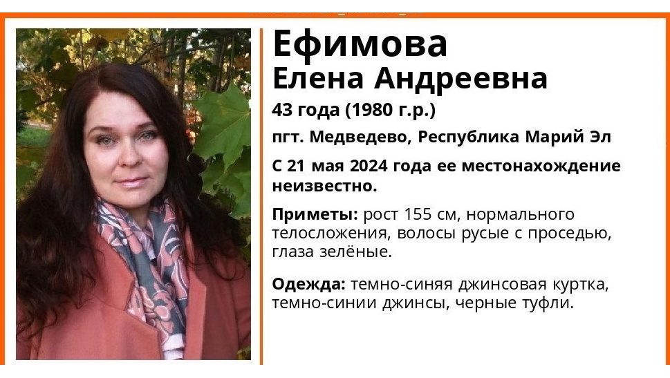 В Марий Эл пропал ещё один человек. С 21 мая неизвестно местонахождение 43-летней Ефимовой Елены Андреевны.