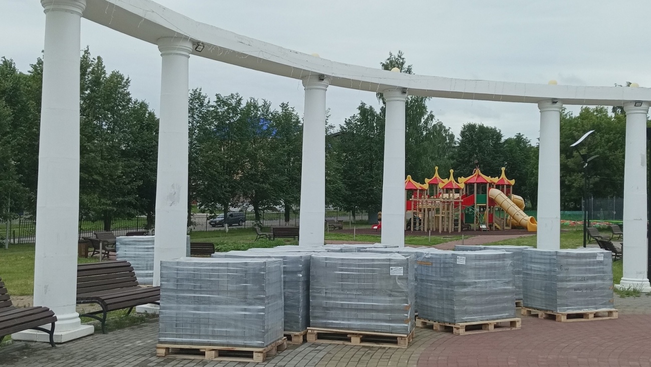 На территории планируют заменить потрескавшуюся брусчатку с использованием песко-цементной смеси. Кроме того, будет отремонтировано резиновое покрытие на детской игровой площадке. Работы уже начались.