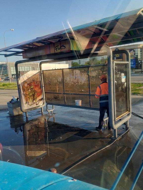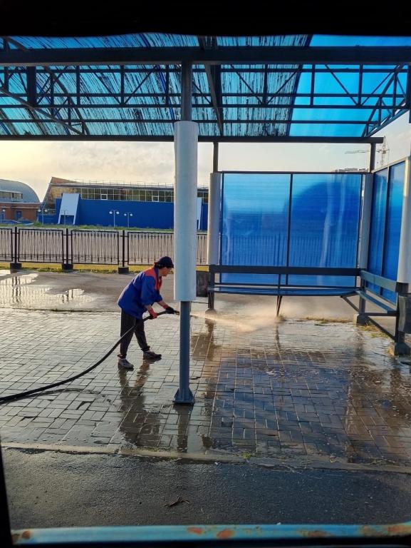 В эти жаркие дни они проводят водные процедуры на цветниках и остановочных павильонах. Растениям, как никогда, нужен полив, чтобы не погибнуть, а остановки промывают от пыли и грязи.