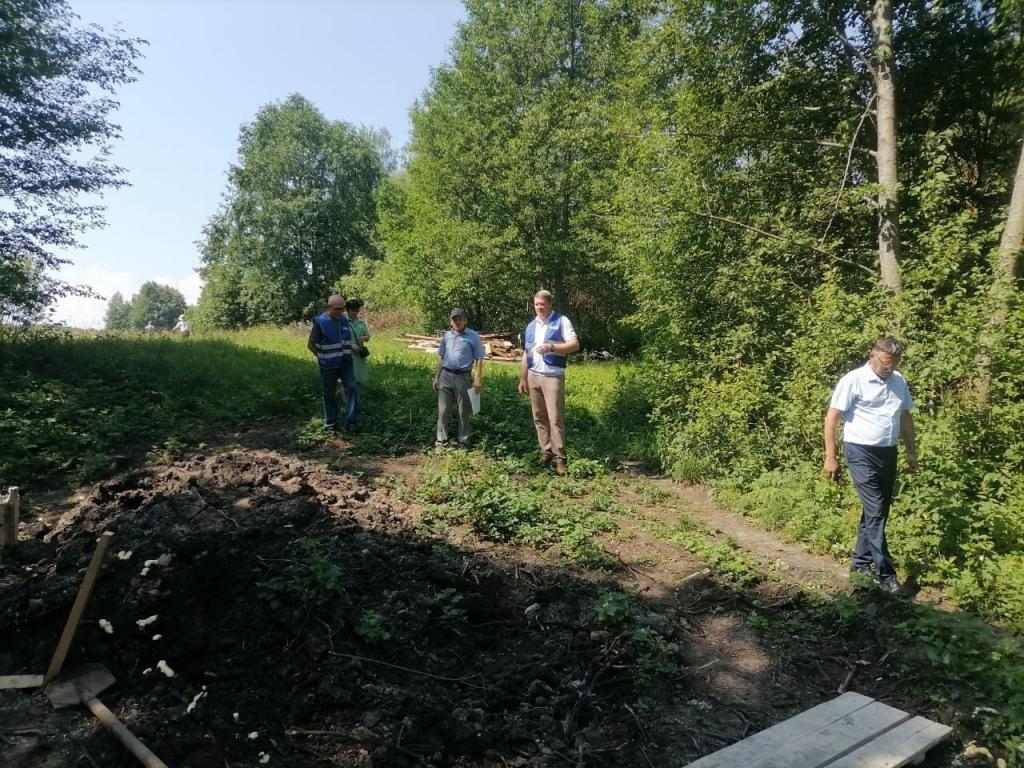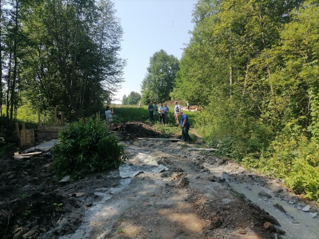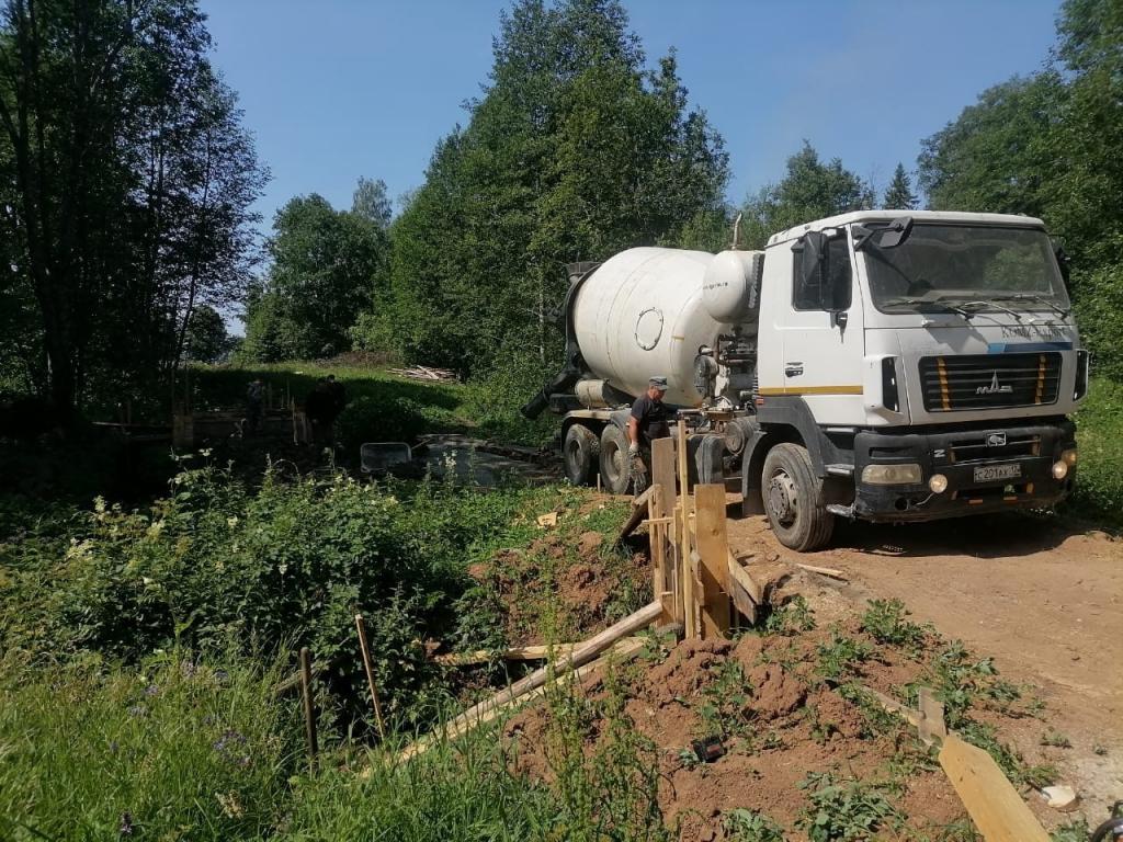 Здесь обустраивают ключ с купелью. Работы в самом разгаре. В оголовки трубы и саму купель уже залит бетон, построены туалет, беседка, подсобное помещение. Завезён сруб, который начали устанавливать над источником.