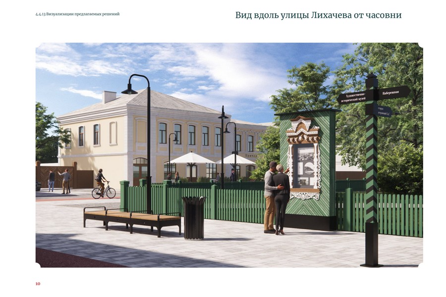 - Предложенная к реконструкции территория связывает парк Горбунцова, городскую набережную и улицу Лихачёва, на которой располагаются музеи и художественные школы, общей площадью 2,5 га. Предусмотрено создание сквера, обновление дорожного покрытия улицы с расширением тротуаров, установкой уличной мебели и навигационных стендов; создание смотрового амфитеатра с видом на Волгу.