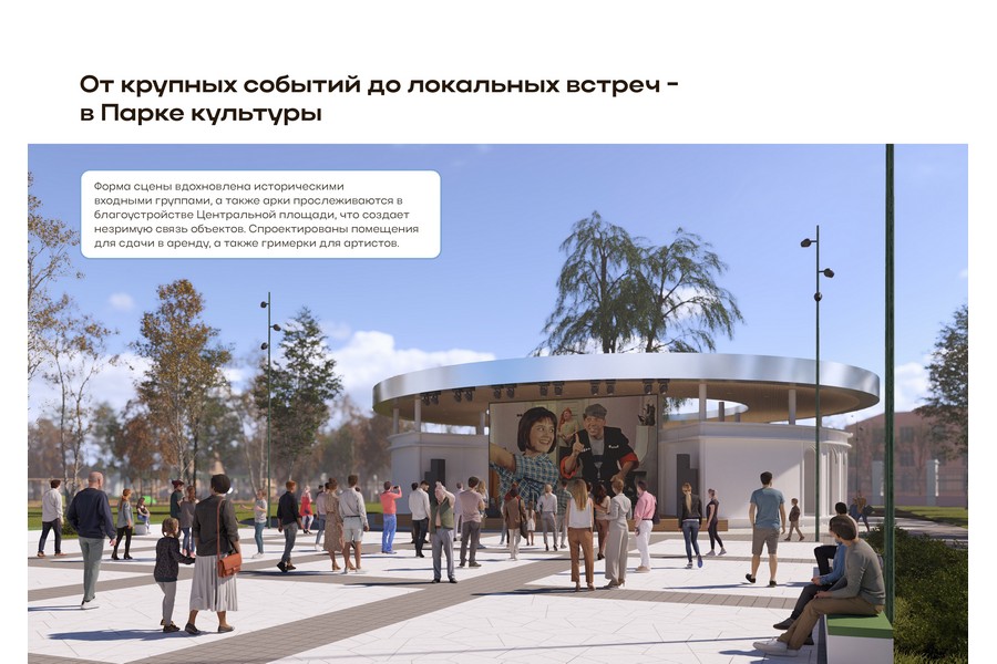 - Проект предполагает обновление парка культуры и отдыха площадью свыше 6 га. Планируется обустроить входную группу, отремонтировать пешеходные дорожки, установить уличную мебель, создать площадь для проведения мероприятий, детские игровые площадки и спортивные зоны, территорию отдыха у воды, реконструировать мост через реку Коноплянка.