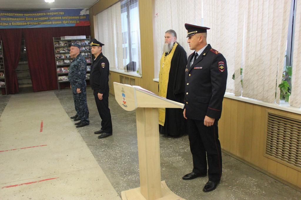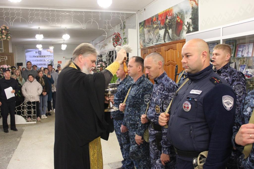 Представитель Общественного совета при МВД протоиерей Александр Бачурин окропил каждого сотрудника святой водой и вручил иконы Святого Георгия Победоносца.