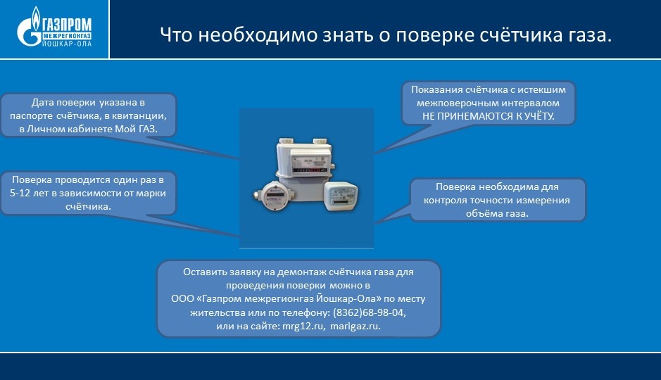 «Поверка газового счётчика необходима для его проверки на работоспособность и пригодность для дальнейшего использования, помогает убедиться, что счётчик исправен и правильно учитывает проходящий через него объём газа. Поэтому мы всегда напоминаем своим абонентам о своевременном проведении поверки приборов учета газа. Кроме того, если поверка счетчика не произведена вовремя, объем израсходованного газа будет определяться по нормативам потребления, которые рассчитываются индивидуально для каждого абонента и зависят от площади отапливаемого помещения и количества зарегистрированных граждан», — отметил заместитель начальника отдела по работе с социально-значимой категорией потребителей ООО «Газпром межрегионгаз Йошкар-Ола» Максим Николаев.