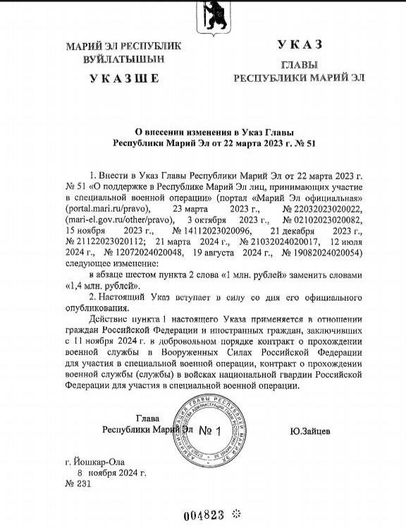 Доброволец, заключивший контракт с Минобороны РФ с 11 ноября 2024 года, теперь получит 1,4 млн рублей. Напомним, ранее выплачивали 1 млн рублей.
