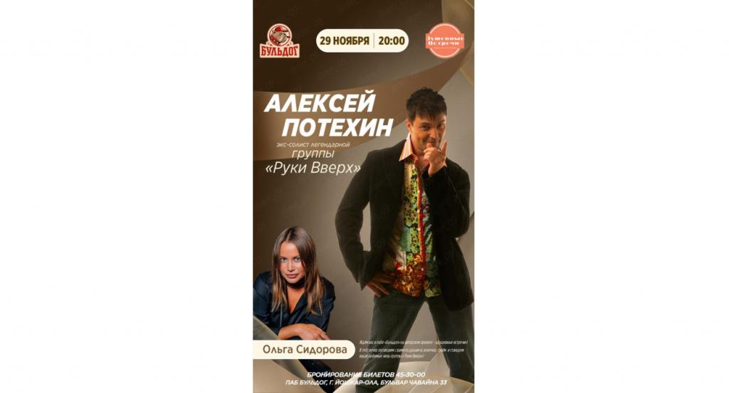 Впервые в Йошкар-Оле! 29 ноября в легендарном пабе «Бульдог» состоится уникальное событие — выступление экс-солиста культовой группы «Руки Вверх!» Алексея Потехина, а также актрисы театра и кино Ольги Сидоровой с программой «Поднимите Руки Вверх». Артисты представят авторский проект «Душевные встречи».