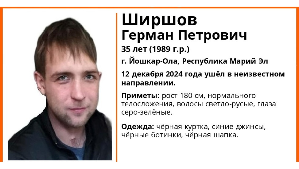 В Йошкар-Оле с 12 декабря не могут найти 35-летнего Ширшова Германа Петровича.