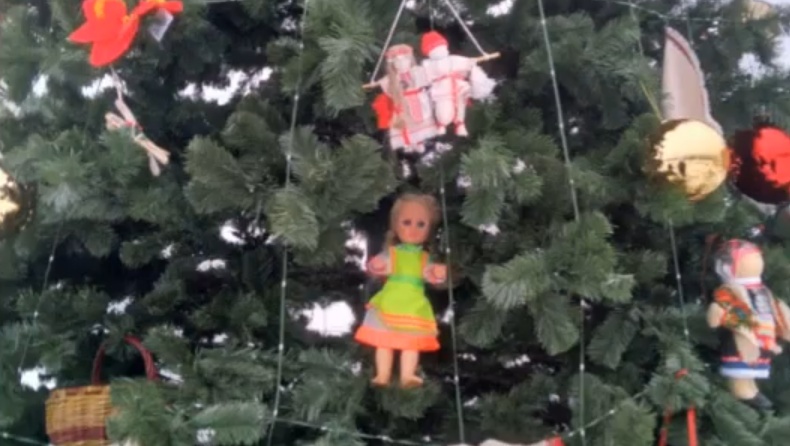 Шестиметровое дерево украсили местные мастера и ремесленники. Деревянные изделия с марийским орнаментом создал Василий Данилов, а куклы в национальной одежде — Елена Кондратьева, многодетная мама из Эмеково. Также на ёлке висят марийские обереги, сувениры из овечьей шерсти и традиционные корзины из ивовой лозы.