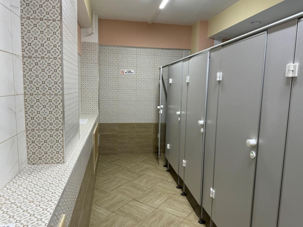 Сейчас здесь завершают ремонт мужского туалета на цокольном этаже. Ранее был приведён в порядок женский туалет. Приступив к работам в декабре 2024 года, бригада рабочих на сегодняшний день уже заменила все коммуникации, уложила новую плитку и устанавливает сантехнику. Отремонтирован третий этаж, в планах также замена дверей.
