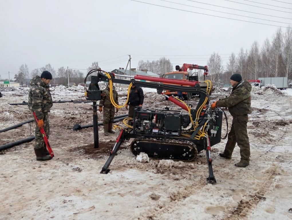 На данный момент строители устанавливают винтовые сваи под будущий объект культуры.