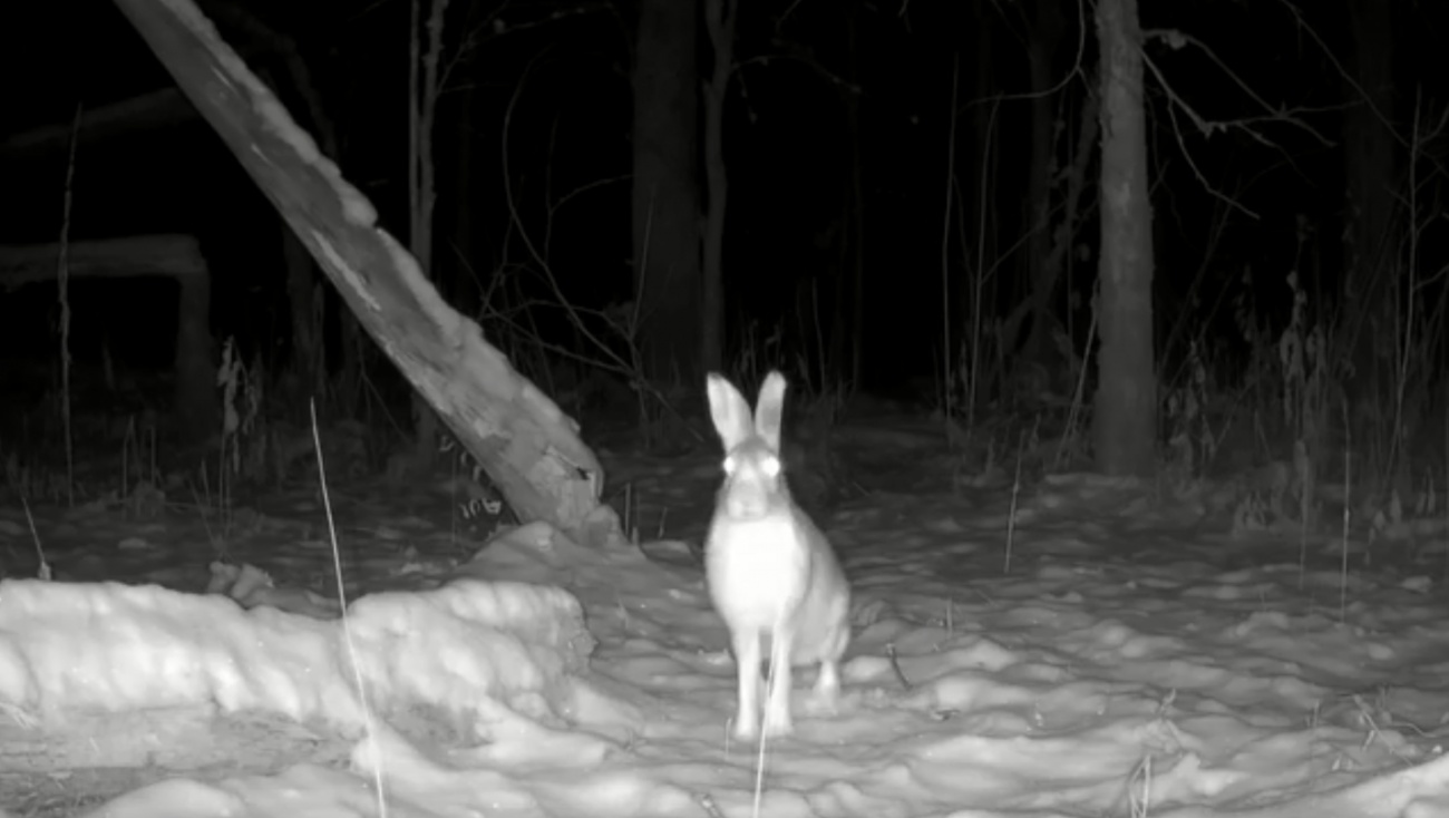 На этот раз в фотоловушку угодил заяц-беляк. Косой осмотрел местность, озираясь по сторонам и прислушиваясь к шорохам, неспешно ускакал дальше в чащу леса.