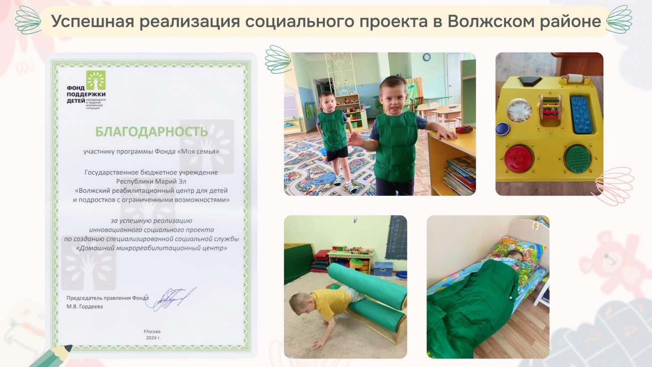 Проект, реализованный с июля 2023 по октябрь 2024 года, обеспечил доступ к реабилитационным услугам детям-инвалидам из Волжска, Волжского и Звениговского районов. В том числе из удалённых населённых пунктов этих районов.