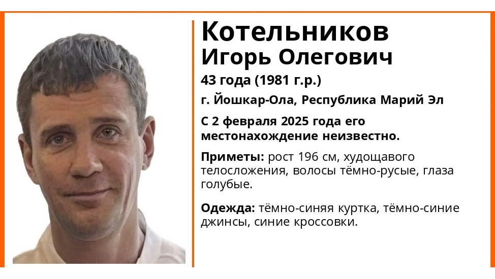 Поисковый отряд «ЛизаАлерт» Марий Эл разыскивает 43-летнего Котельникова Игоря Олеговича.