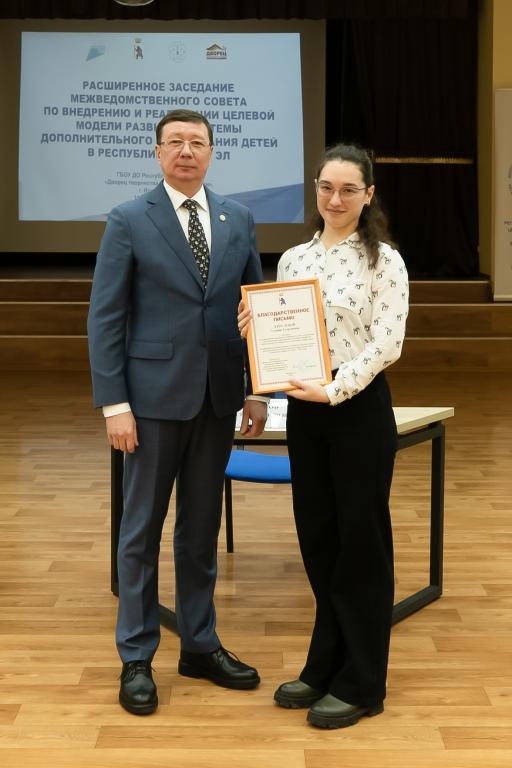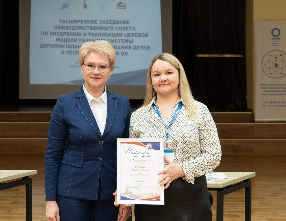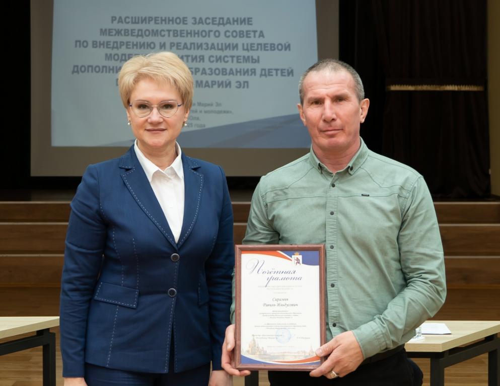 На заседании зампредседателя Правительства Марий Эл Константин Иванов и министр образования и науки Лариса Ревуцкая вручили специалистам допобразования заслуженные награды за их вклад в развитие системы при реализации целевой модели.