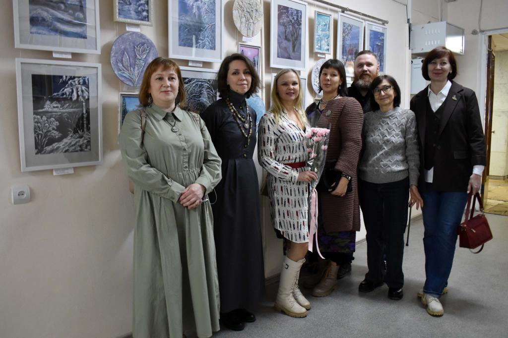 На экспозиции представлены зимние пейзажи и натюрморты, выполненные в различных художественных техниках: пастель, гуашь, масляные краски, объёмная живопись.
