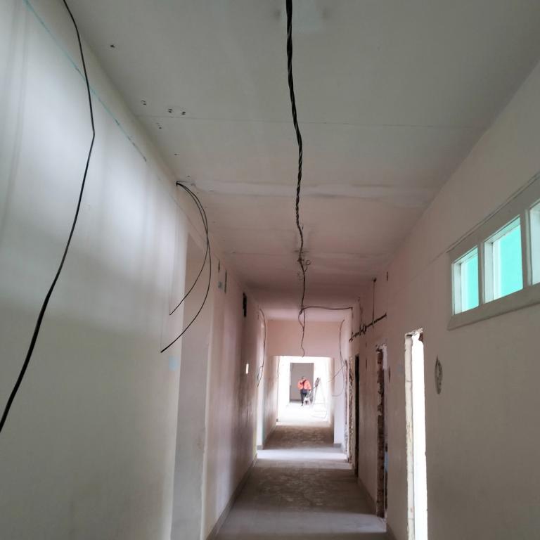 На данный момент подрядчики уже утеплили фасад здания, заменили системы водоснабжения и отопления. Продолжается замена электрики.