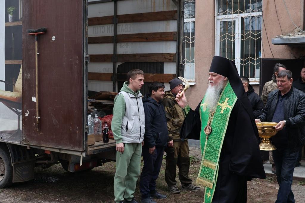 Владыка Феофан поздравил собравшихся с двунадесятым праздником и благословил в дорогу людей, сопровождающих груз.