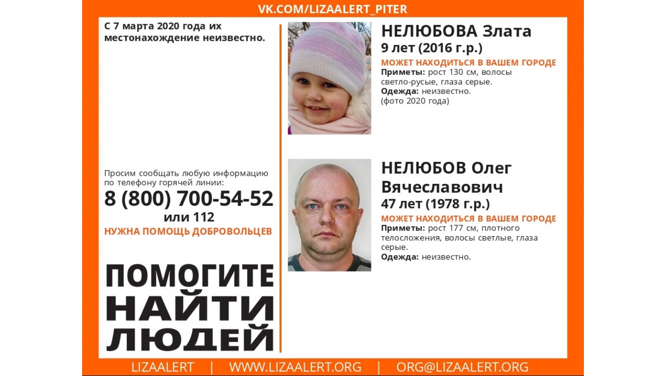 Поисковый отряд «ЛизаАлерт» обращается к жителям Марий Эл с просьбой оказать содействие в поиске девочки и её отца. Пять лет ничего неизвестно о судьбе Златы и Олега Нелюбовых.
