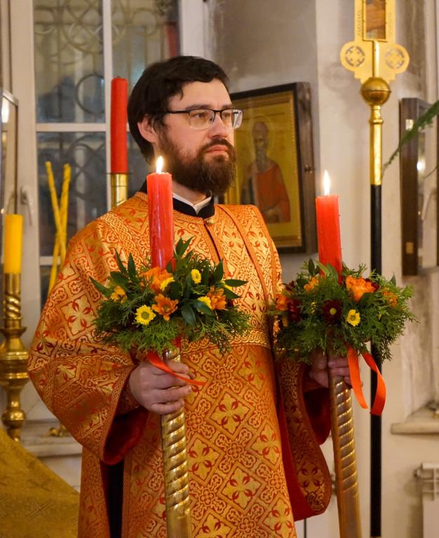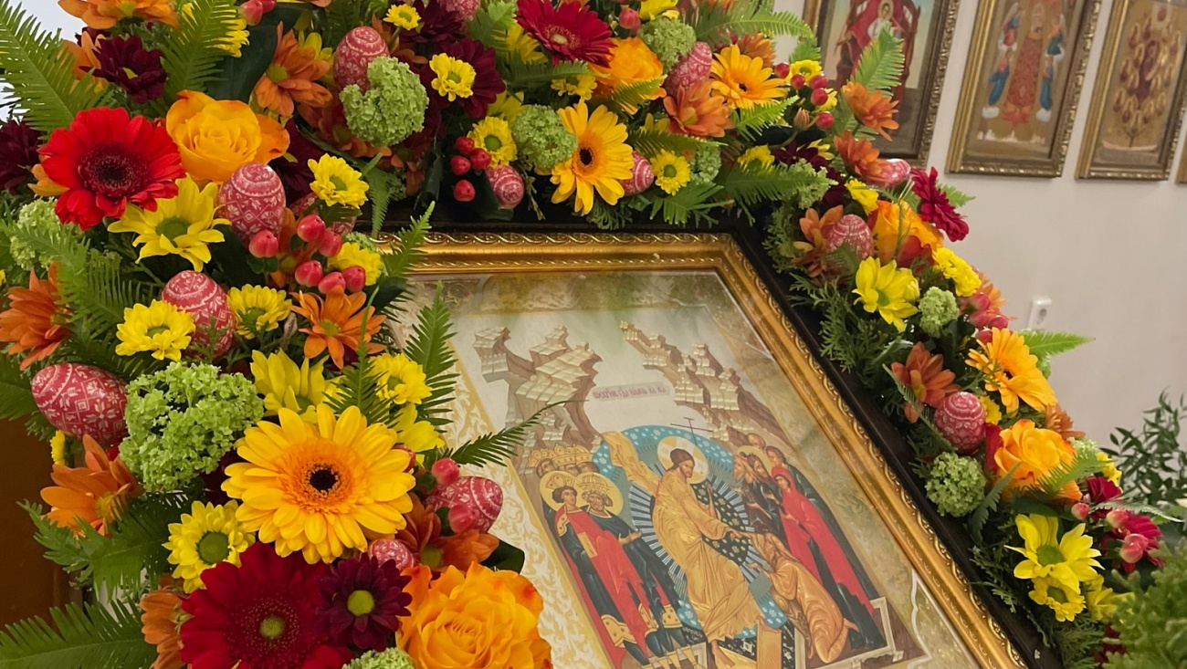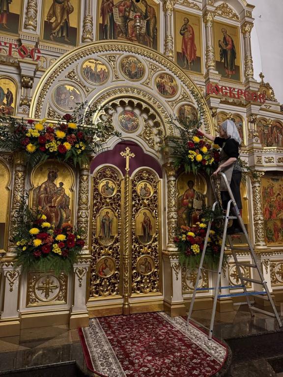 Благоукрасители оформили цветами иконы и различные церковные принадлежности, которые используются в богослужении.