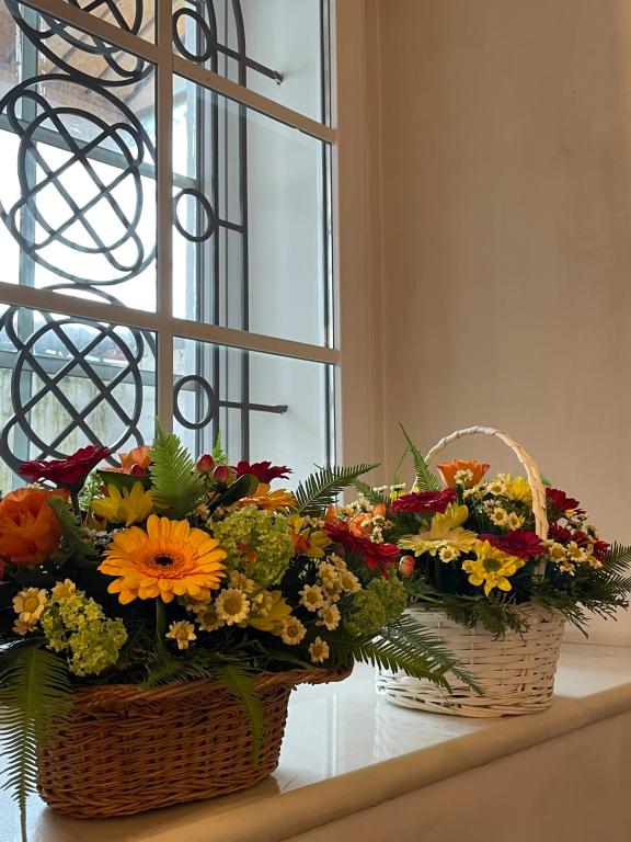 Также флористы собрали корзинки с букетами, которые расставили по центру храма.