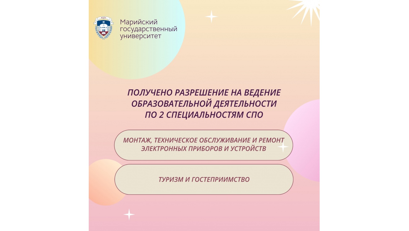 Марийский государственный университет расширяет образовательные возможности: получено разрешение на ведение образовательной деятельности ещё по 2 специальностям среднего профессионального образования.