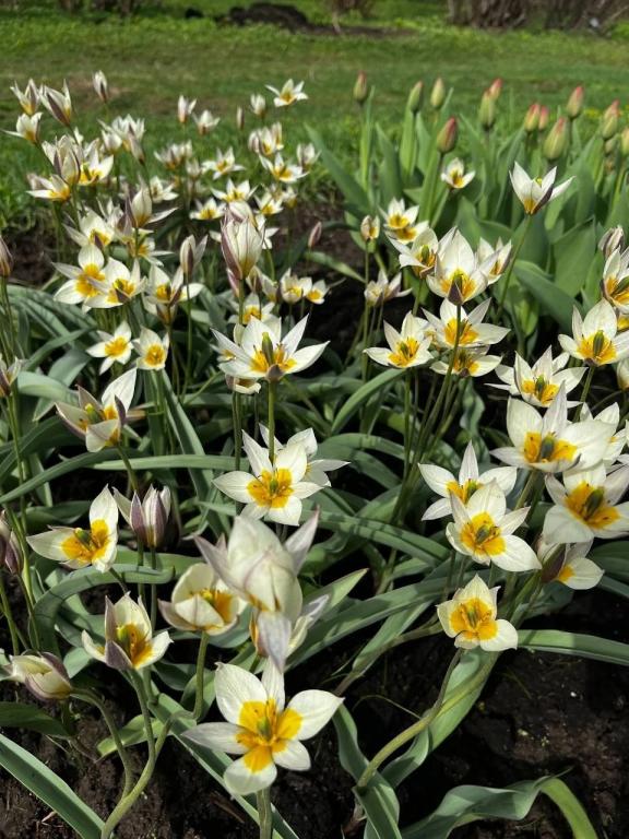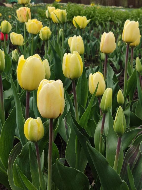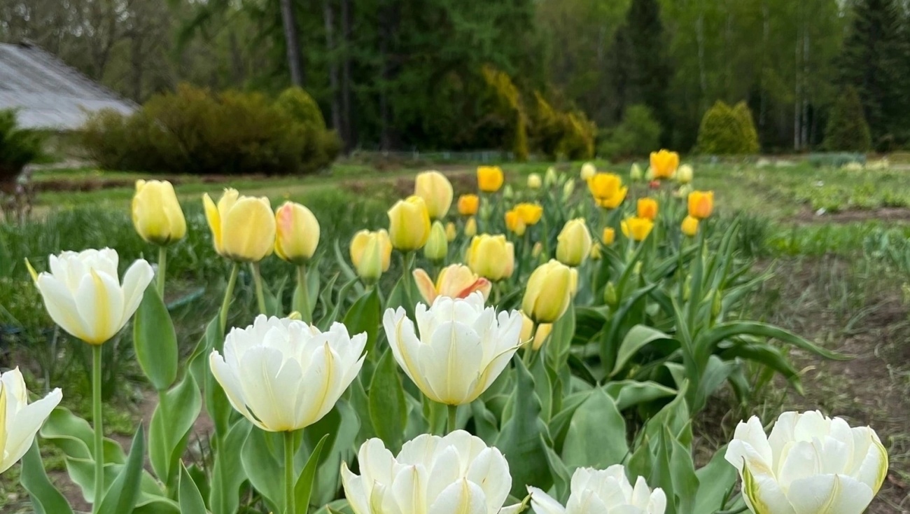 Цветочное поле в самых разных оттенках можно увидеть в Ботаническом саду. По соседству с ними уже благоухают гиацинты, а рядом, такие же наливные, красуются нарциссы.