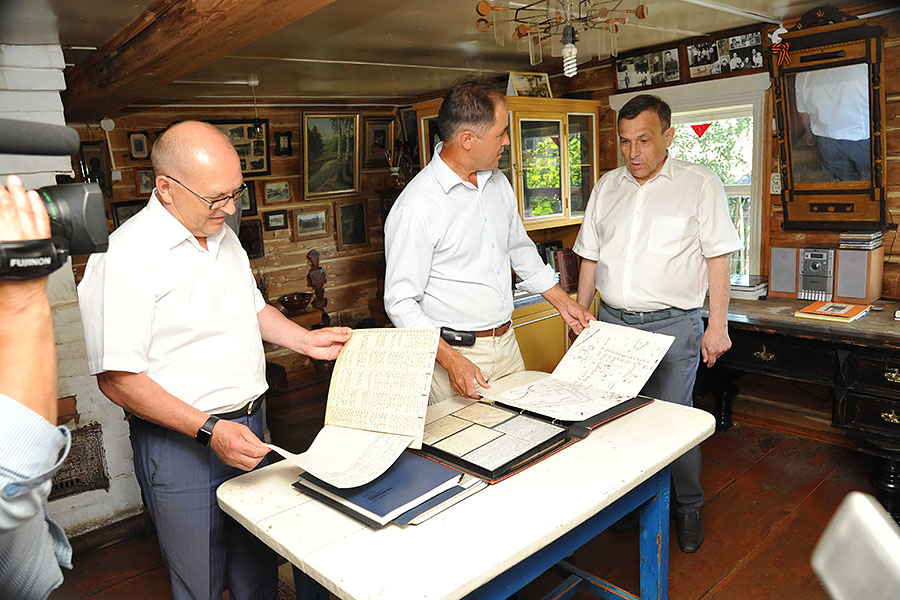 Сергей Алдушкин поделился с главой региона Александром Евстифеевым о жизни в Мороскино и летописи своей деревни: художник создал историческую карту с номерами домов и указал их расположение, как это было в начале 20 века. Собрал заметки о тех людях, которые жили в этих домах, об их занятиях и родственниках.