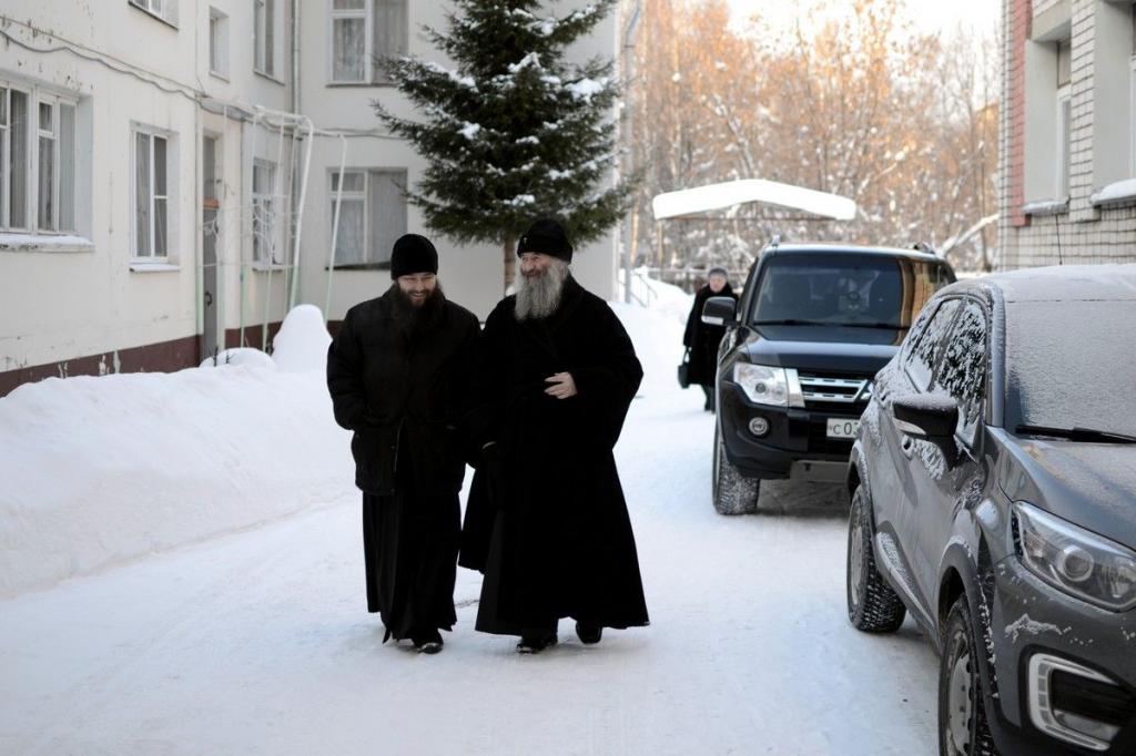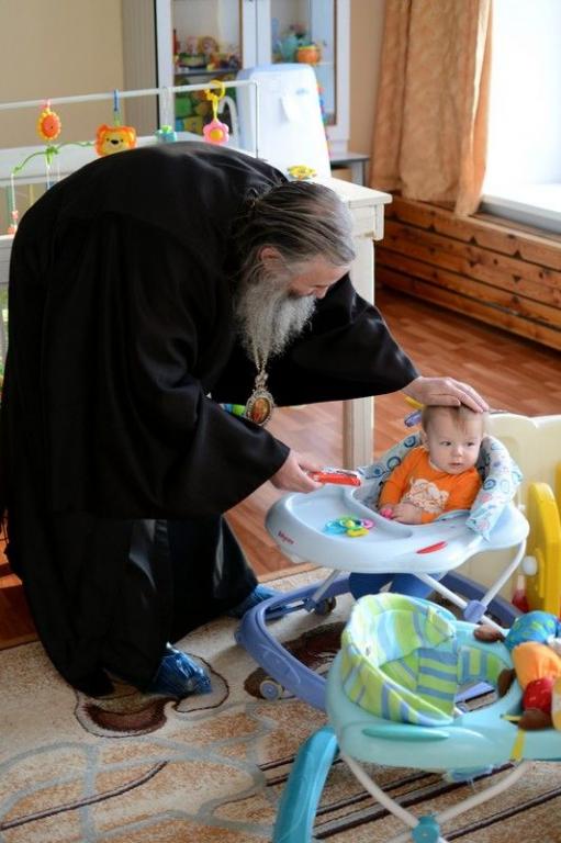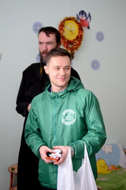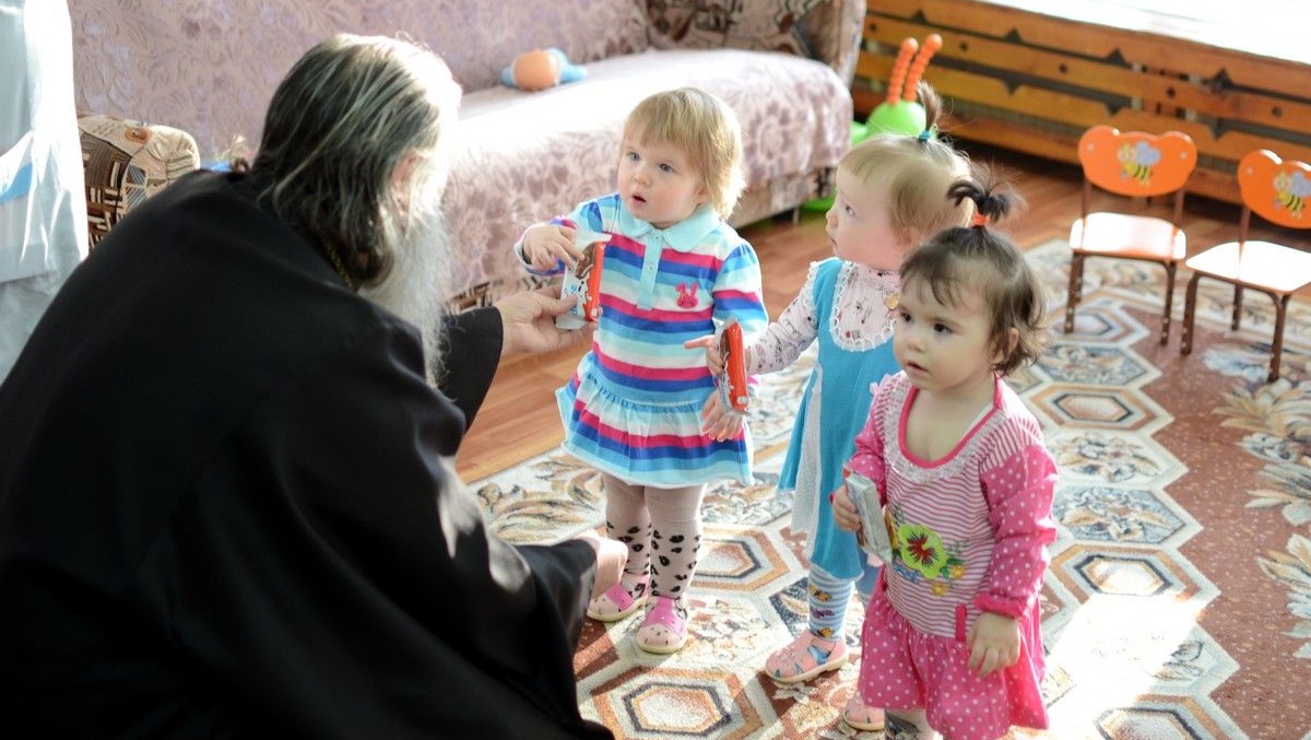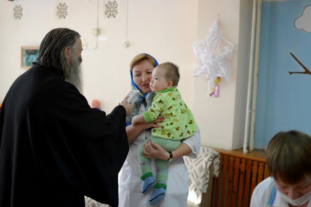 Вместе с владыкой приехали навестить малышей протоиерей Алексий Вязов, окормляющий «Дом ребёнка», православные добровольцы.
