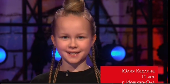 11-летняя Юлия Карлина из Йошкар-Олы прошла слепое прослушивание в популярном музыкальном проекте на Первом канале — «Голос. Дети» (6 сезон, 6 выпуск). Девочка исполнила песню Кэти Перри «Что происходит?».