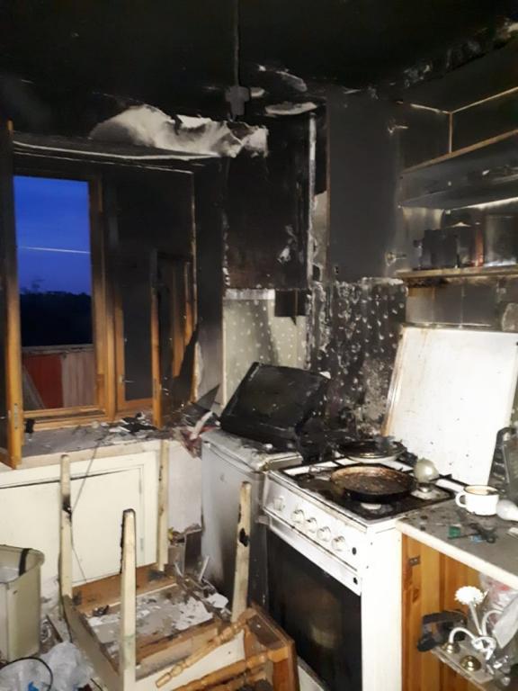 Открытого горения в квартире не наблюдалось. Тлел телевизор на кухне. В результате происшествия закопчена мебель и внутренняя отделка кухни.