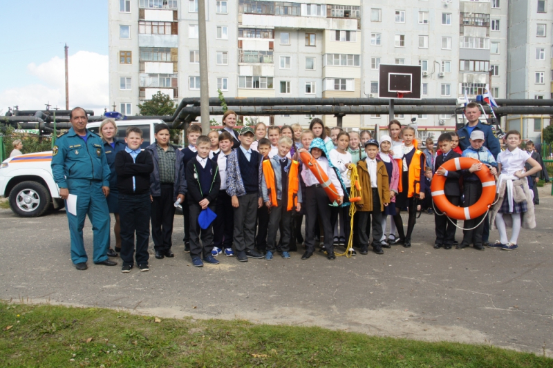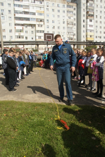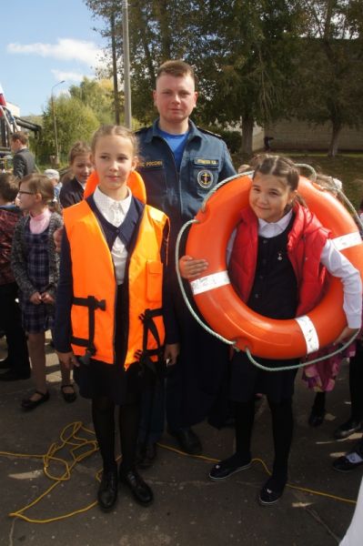 В это же время на школьной площадке занятия проводили специалисты государственной инспекции по маломерным судам. Дети познакомились со спасательными средствами, которые нужно использовать при возникновении экстренной ситуации на воде или на льду. Они учились правильно бросать спасательный круг и конец Александрова.